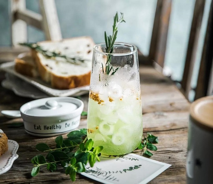 制作方法: 將黃瓜和蜂蜜加入雪克壺中攪拌,隨后加入芒果泥和青檸汁,加冰搖晃后過濾倒入容器,將干姜水從頂部倒入并攪拌。