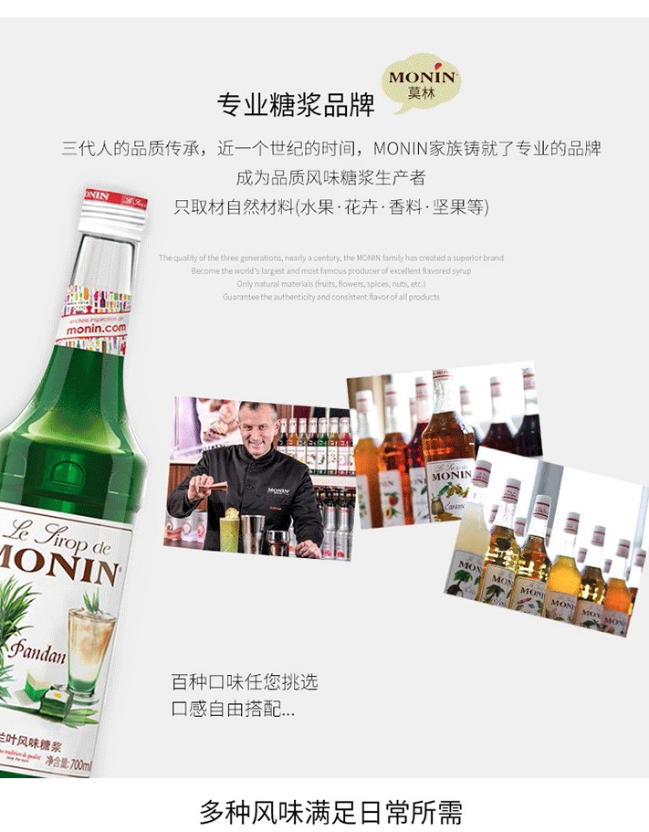 1912 年,Georges MONIN在法國創(chuàng)立了以家族名字命名的品牌與第一家工廠,專注生產(chǎn)優(yōu)質(zhì)利口酒與糖漿。因他對待品質(zhì)的熱誠與執(zhí)著讓產(chǎn)品脫穎而出,讓MONIN成為優(yōu)質(zhì)產(chǎn)品的代名詞,現(xiàn)已是世界上著名的風味糖漿生產(chǎn)者。近年來,MONIN堅持不斷創(chuàng)新,嚴打新風味與應(yīng)用方式,致力于傳遞完美餐飲體驗,引領(lǐng)飲品多元化發(fā)展,為餐飲企業(yè)提供完美解決方案!